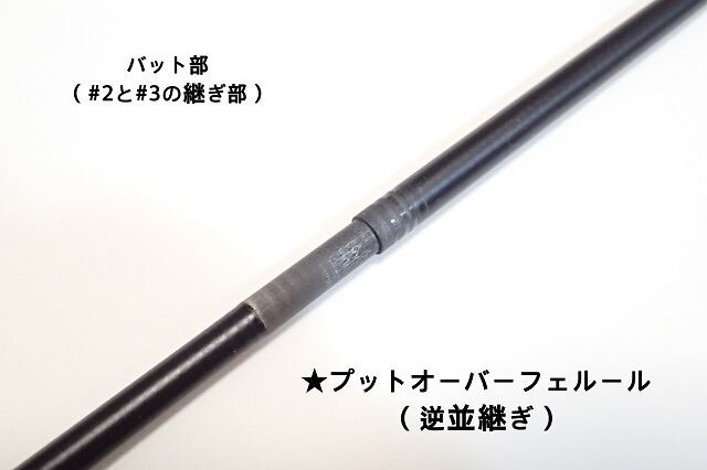 ◆ベリーセクション(#2)とバットセクション(#3)の継ぎ部は『プットオーバーフェルール(逆並継)を採用。これは急テーパーなベリーセクション(#2)を印籠継にするとかなり手元が太く重くなる為、バットセクション(#3)を細く少し肉厚で軽量かつ強靭にし、逆並継を採用しました。