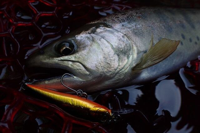 小スポットでピックアップする寸前の最後の最後まで大きなダートアクション(横の動き)で魚を誘うことができます。
