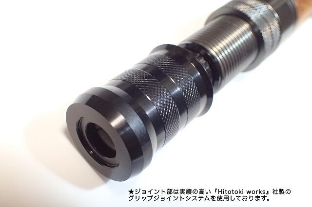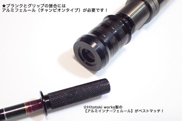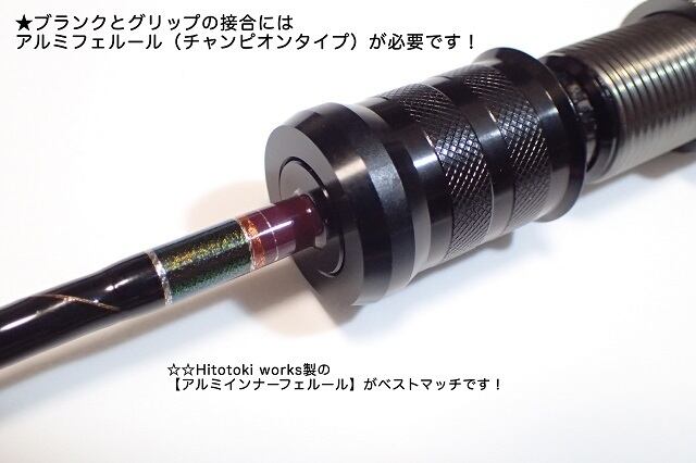 ・ブランクとグリップの接合には専用の「Hitotoki works アルミインナーフェルール」が一番綺麗に収まります。その他JUSTACE等から販売されている一般的な「チャンピオンタイプ」フェルールでも使用可能です。